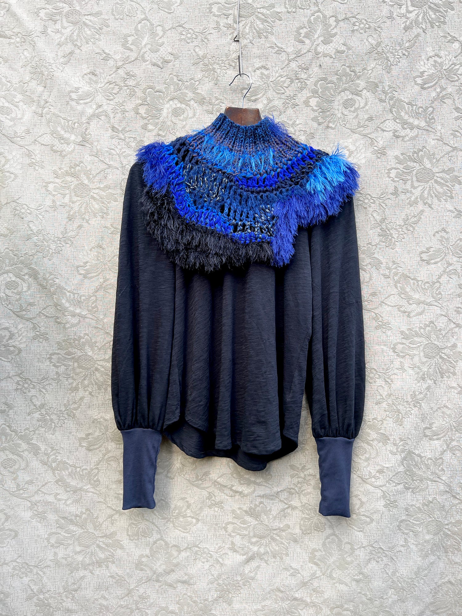 Wrap yourself in this one-of-a-kind neckpiece and feel the warmth of something special. Hand-knit and hand-crocheted with a mix of soft textured yarns, a touch of faux fur and wispy fringe.
