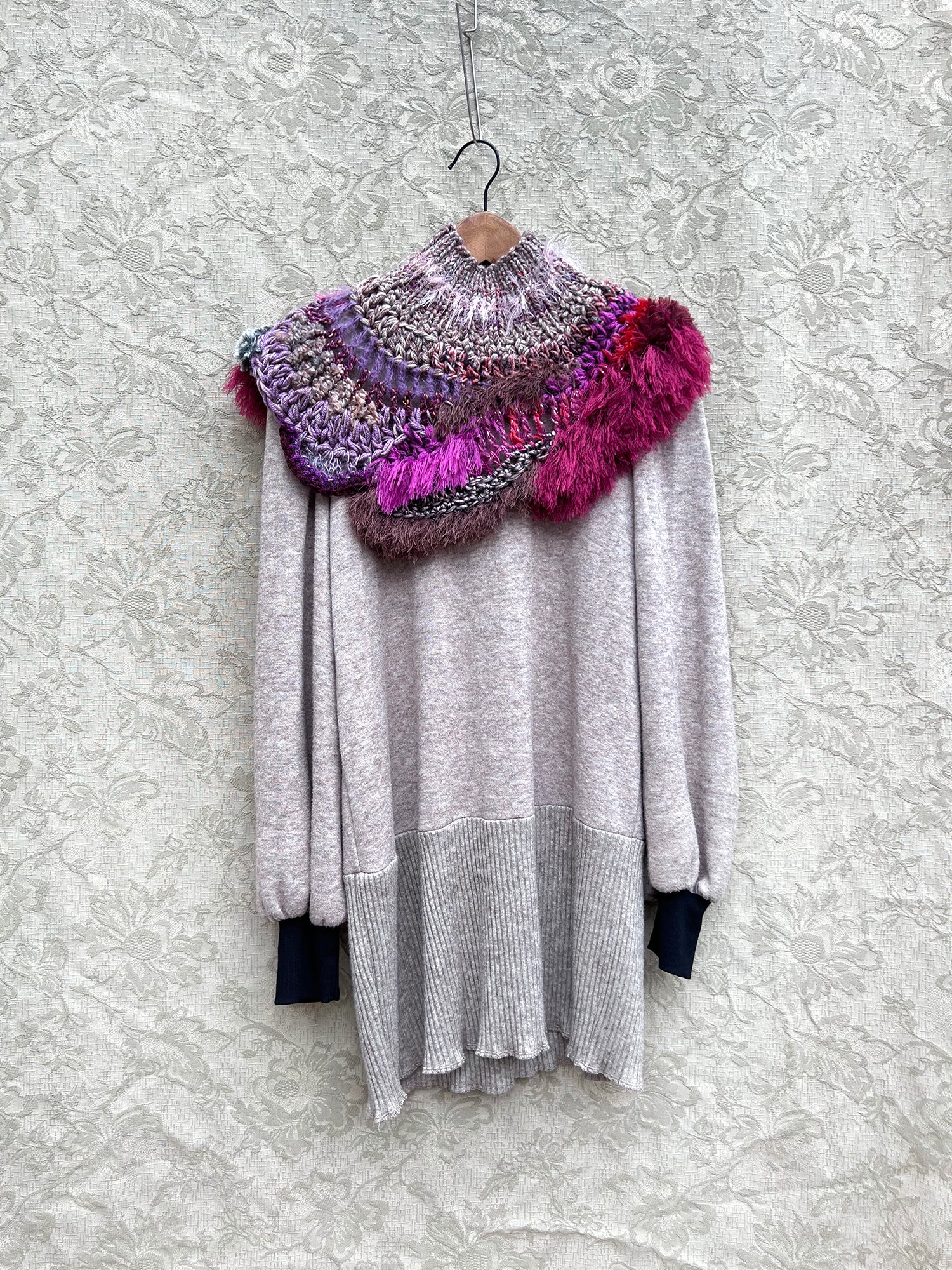 Wrap yourself in this one-of-a-kind neckpiece and feel the warmth of something special. Hand-knit and hand-crocheted with a mix of soft textured yarns, a touch of faux fur and wispy fringe.